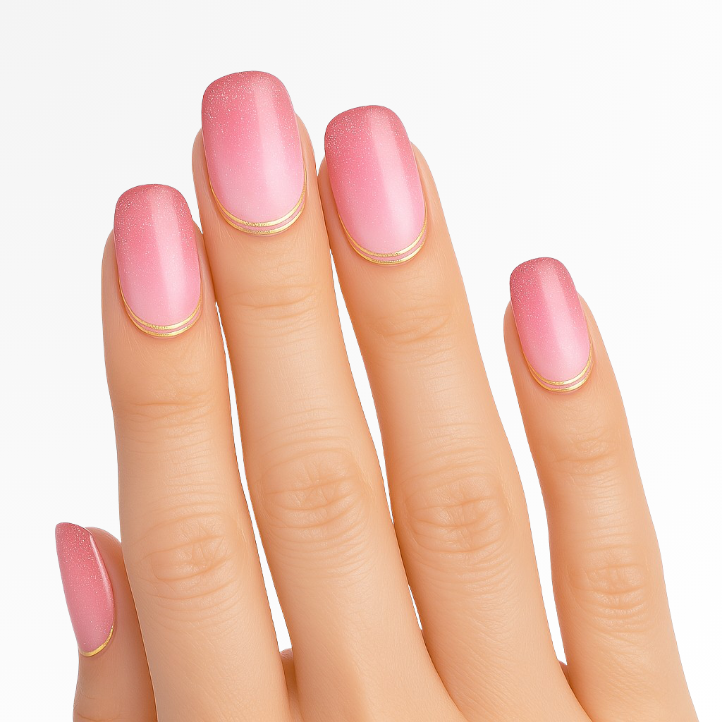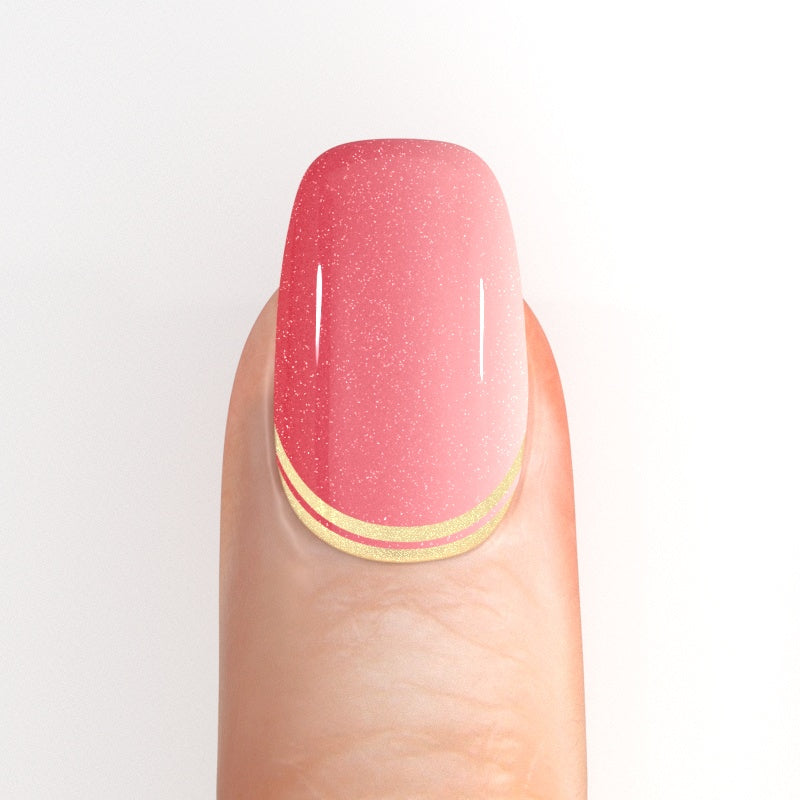 Lo smalto rosa brillante e lucido ricopre l'intera superficie dell'unghia, creando un effetto luminoso e vibrante. Una sottile linea dorata è disegnata alla base dell'unghia, aggiungendo un tocco di raffinatezza e lusso. Questo design discreto ma raffinato è perfetto per chi cerca una manicure chic ma audace.